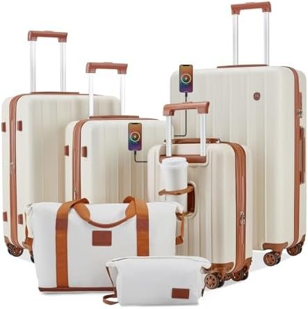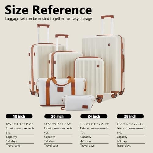 6 Piece Luggage Sets – The luggage set of 4 pieces offers 18″/20″ carry on luggage, 24″ medium checked luggage, 28″ large check-in suitcase, duffel bag with straps and toiletry bag, can be nested together for easy storage