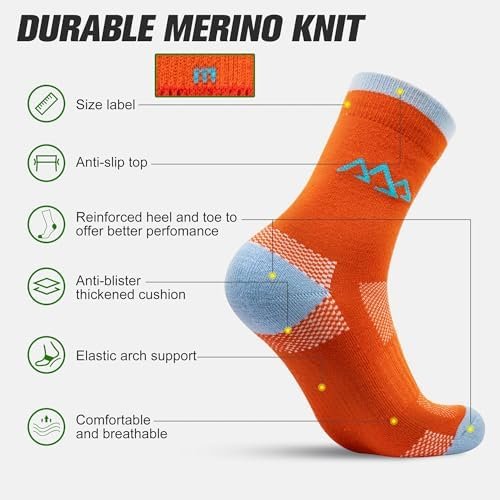 【MATERIAL】72% merino wool, 13.5% spandex, 9.5% elastane, 5% nylon. Featured with impact cushioning and ventilation zones, and keep your feet warm in cold weather and stay fresh and dry in any weather. SIZE: S (Women: 4.5-7.5 US Size). Each pair socks weight 0.12lb/53.7g.