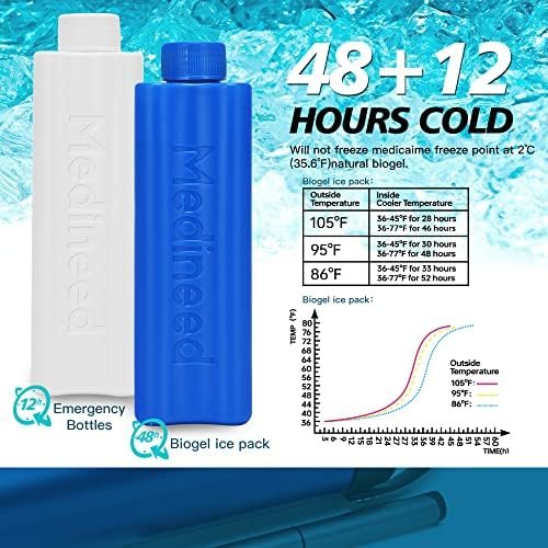 GOOD COOLING: MEDINEED insulin cooler travel case solve the problem of refrigerating medications on the go; Biogel ice pack has great cooling capacity, even if at an ambient temperature of 105℉, ensuring that insulin would keep the temperature at 36-45℉ for 28 hours