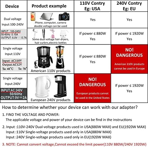 【Upgrade Worldwide Adapter】:100% Suit for all usb devices likes Phones, Cameras and Laptops, tablets and other small power dual voltage appliances used all over the world. And Suit for selective Dual Voltage Hair Dryer, Dual Voltage Straightener, and Dual Voltage Curling Iron etc. Please check with the pic and video, or contact us WHEN USING HIGH POWE DIVICE TRAVEL PLEASE MAKE SURE YOUR DEVICE SUPPORTS DUAL VOLTAGE (110V Max 880W,Like USA;250V Max 2000W,Like EU )