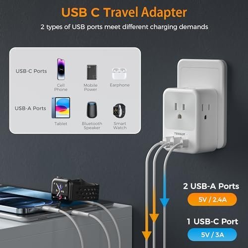 Italy Plug Adapter with USB C: Dual USB A ports can charge up to 2.4A, the USB C port provide charging speed up to 3A; 2 types of USB ports can detect charged devices and give you more charging options; Ideal for cellphone, tablet, earphone, etc