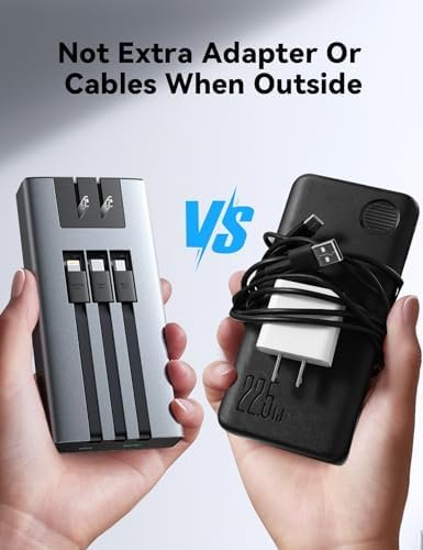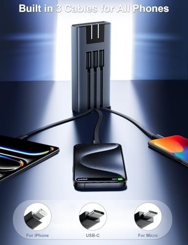 [Widely Compatibility] Portable battery charger has built-in Lightning cable, USB-C cable and Micro cable, which charges almost any device, such as iPhone, iPad, Samsung, Google Pixel, tablets, also work with smaller devices like bluetooth headphones, AirPods, fitness trackers, smart watches, etc