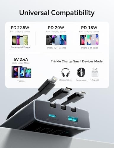 [PD 22.5W Fast Charging] The USB A port of the portable charger power bank supports up to 22.5W fast charging output, comes with 2 output ports and 3 output cables, which can support 5 devices charging max simultaneously