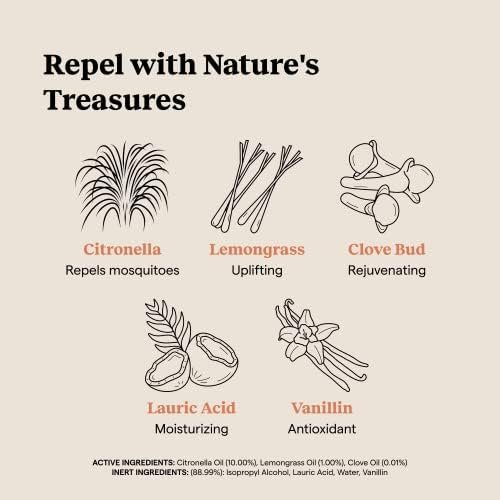 Repels, uplifts and rejuvenates: Natural and effective, our spray contains citronella, lemongrass, clove bud, lauric acid, and vanillin – No DEET or picaridin, just safe, non-toxic protection
