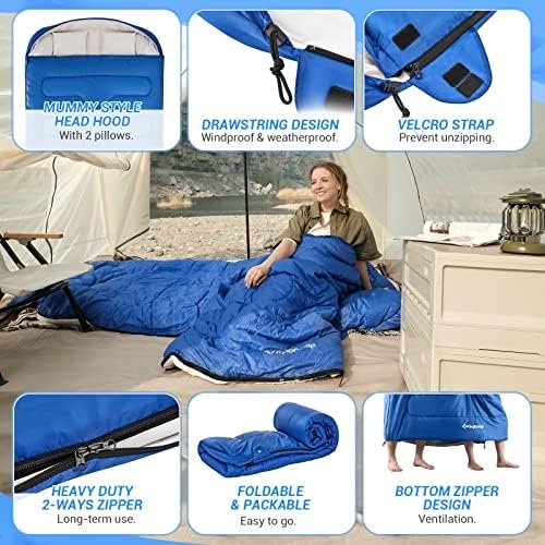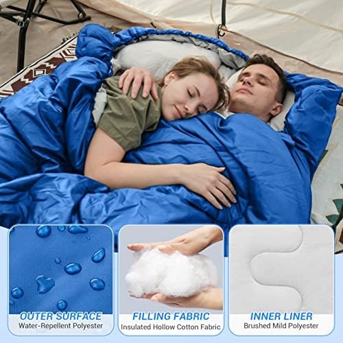 【LARGER & WIDER】Measuring 93″ X 63″ in size, this 2 person sleeping bag can comfortably sleep two adults. It is ideal for young families camping outdoors. Stuffed into a 15″*8″ size bag, you can embark on any outdoor adventure, such as camping, backpacking, hiking, or a road trip.