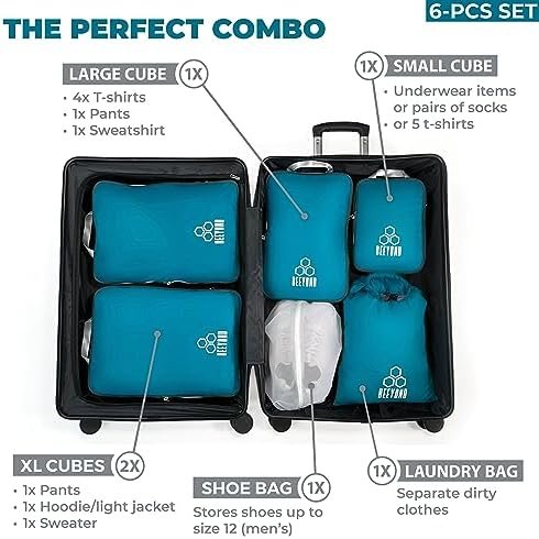 The set includes 6 items (2x extra-large cube, 1x large cube, 1x shoe bag, 1x laundry bag)—one XL cube: pair of pants, hoodie, sweater, one L cube: 3x t-shirts, 1x pants, and 1x sweatshirt. The small cube is ideal for 5 t-shirts and is also ideal for underwear items (bras, boxers, etc.) or 8 pairs of socks. The additional shoe bag stores shoes up to size 12 (men’s). The laundry bag is great for dirty laundry.
