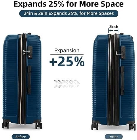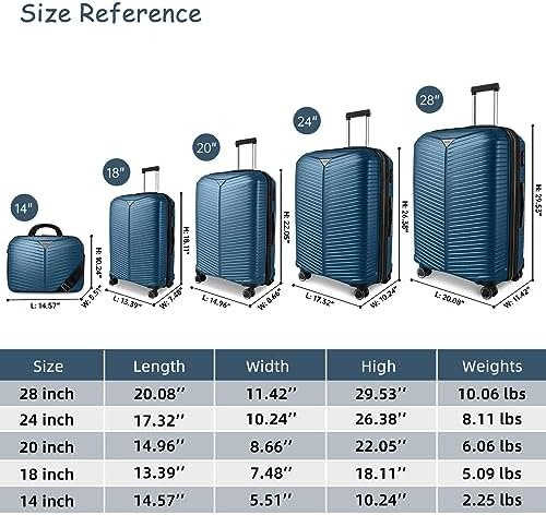 5 Piece Luggage Sets: 28inch, 24inch (ONLY 28inch and 24inch are expandable, adding 25% space capacity for hardshell luggage),18inch, 20inch and 24inch luggage is perfect for business and personal travel, 14inch suitcase can store can store toothbrush,wallet,makeups,etc.
