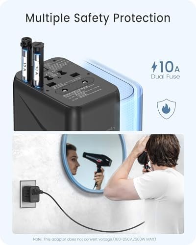 【Portable and Safety】Compact (1.9*2.5*2in) and lightweight (5oz) design which help you to save your precious luggage space and make a great travel companion for your trip. Having NO surge protection, NO cord makes it fully cruise ship approved. The worldwide adapter with double fuse (fuse standard: 250V 10A), integrated security shutters, guard your travel security.