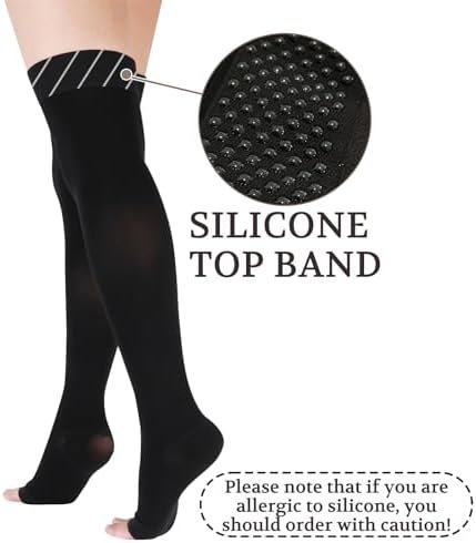 Silicone band for wearing comfort yet snugly fit to ensure the stockings remain in place without constricting your leg. Please note that if you are allergic to silicone, you should order with caution.