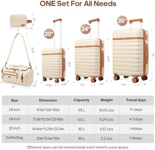 5-Piece Affordable Luggage Set: This versatile hardshell suitcase set includes a 20-inch carry-on, 24-inch cabin suitcase, and a spacious 28-inch checked suitcase, along with a handy travel tote bag and a practical toiletry bag—everything you need for both short getaways and extended vacations.