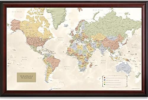 A GIFT YOU WILL BE PROUD TO GIVE: We use a wood frame on every map. If you want a cheaper version, you can definitely find them, but this world map with push pins is the finest quality. The wood frame is stained in a classic mahogany finish and is just stunning! You will be proud to give this as a gift, complete with personalization to make each world map as unique as the recipient!