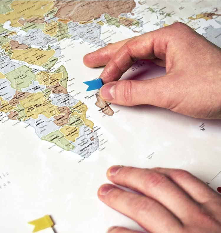 50 Red pins to mark where you’ve been 10 Green pins to mark your dream travel destinations 2 Blue flags to mark where you are going next 5 Yellow flags to mark your favorite destinations so far