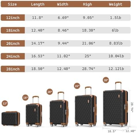 7 Piece Luggage Sets: The luggage set of 4 pieces offers 12″mini suitcase,18″/20″ carry on luggage,24″ medium checked luggage,28″ large check-in suitcase, Expandable handbag and storage bags,can be nested together for easy storage.