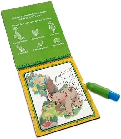 No-mess painting for kids! This exciting paint-with-water coloring book includes four reusable pages and a refillable water pen. Simply use the pen to color in each scene–details and vibrant color appear with every stroke! Then let the page dry to erase the pictures and fill it in again and again. This jungle-themed book includes four scenes to color, and a search-and-find activity for each scene. The chunky-sized water pen is easy for kids to hold and stores neatly right in the front cover, so Water Wow books make ideal travel activity books and travel toys for kids. Our water-painting books for kids help promote fine motor skills, early writing/reading skills, and visual discrimination. Each spiral-bound pad has 4 reusable pages and a water pen that stores in the cover. The Melissa & Doug On the Go Water Wow! Jungle Activity Pad is a delightful and educational gift for kids ages 3 to 7. Add a Melissa & Doug Reusable Sticker Pad to round out the hands-on and screen-free play experience. For more than 30 years, Melissa & Doug has created beautifully designed imagination- and creativity-sparking products that NBC News called “the gold standard in early childhood play.” Today, Melissa & Doug is proudly partnering with the American Academy of Pediatrics to foster early brain development and help children build important life skills through play.