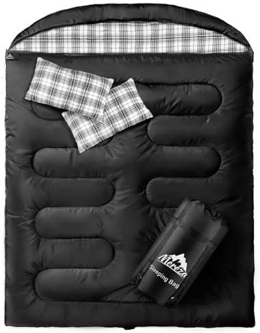 SUPER WARM AND COMFORTABLE: MEREZA double sleeping bag is perfect for family camping in cold weather, skin-friendly flannel lining and 400GSM high level 3D synthetic fiber filling for optimum warmth insulation. 210T waterproof rip-stop polyester shell prevent damp from entering. Triple thermal design offer a warm sleeping night for your outdoor adventurer