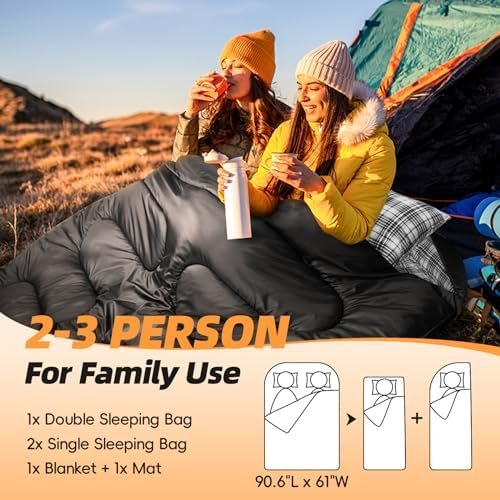 BIG & TALL DESIGN FOR COMFORT: Measuring 90.6″L x 61″W, this adult double sleeping bag is larger than regular xl sleeping bags and comfortably fits 6.5 ft tall adults with plenty of room for both legs and arms to stretch out. Featuring 2-way zippers, large sleeping bag can also be fully unzipped and laid flat, turning the sleeping bag into a large blanket or a pad