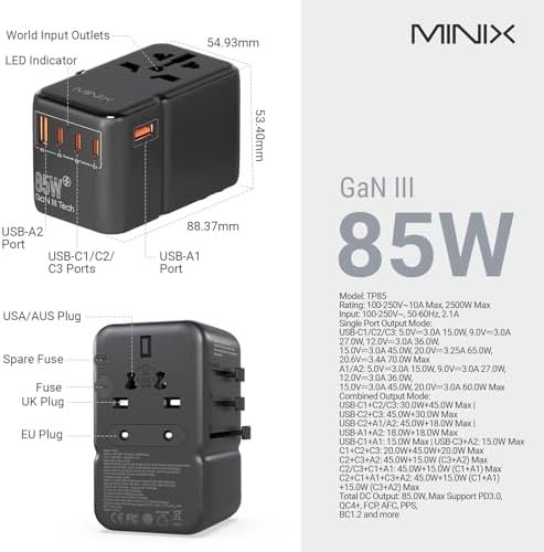 MINIX TP85 Universal Travel Adapter with 85W PD Ports GaN International AC Socke…
