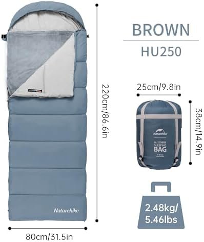 PORTABLE STORAGE: The storage size is HU250: φ25cm(9.8in)×38cm(14.9in). The weight is 2.48kg/5.46lbs and each sleeping bag comes with a compression bag with a strap for easy storage and portability