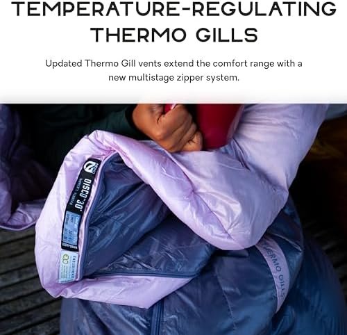 Disco includes a set of next-generation Thermo Gill vents on the chest to offer fine-tuned temperature control and a better outdoor sleeping experience. Each Gill features an interior and an exterior zipper with a draft-blocking intermediate layer, allowing several different configurations for dialing in the bag’s temperature without direct exposure to cold air. Our Blanket Fold draft collar at the neckline features a redesigned size and shape to further optimize sleep temperature. Tucked in, the Blanket Fold defiantly blocks any chill while mimicking the comfort of your bed at home. Pushed out, it helps dump excess heat instantly. Finally, Disco’s revamped design has baffles insulated with water-resistant, RDS-certified down, placed vertically along the torso for comfort and aligned horizontally below the waist to prevent down migration.