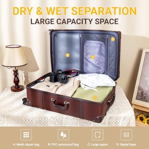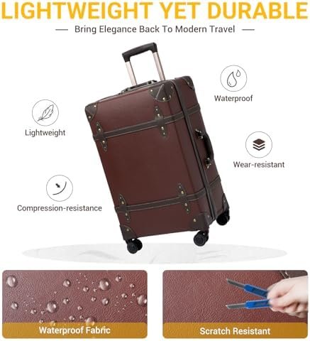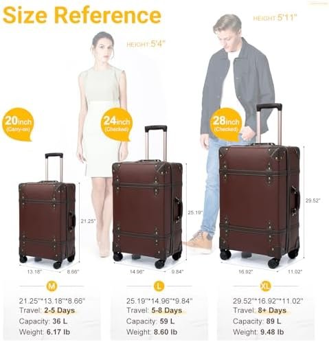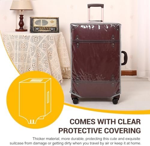 3 PCS Retro Luggage Set: The 20″, 24″, and 28″ sizes are ideal for all your travel needs, whether you’re heading out for a weekend escape or an extended journey. They nest perfectly for space-saving storage and can even serve as home decor when not in use. Each set also includes a clear protective cover to prevent scratches during airport handling.