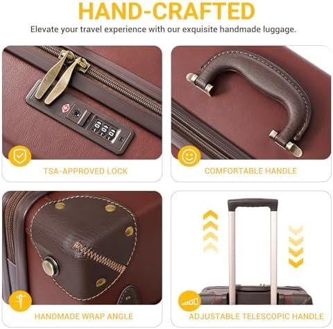 Vintage inspired Luggage: Our suitcases feature meticulously handcrafted corner wraps and rivets that not only enhance their texture but also add a touch of retro charm and metallic elegance. This exquisite fusion of artisanal craftsmanship and vintage style creates a truly unique and fashionable aesthetic.