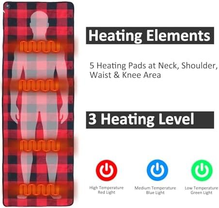 5 HEATING ZONES: The heated sleeping bag pad has 5 heating elements to efficiently transfer heat directly to the core of your body, with 3 adjustable heat levels (green light for low temperature 104℉, blue light for medium temperature 122℉, red light for high temperature 140℉) you can change the heat setting of your sleeping bag heater with the push of a button.