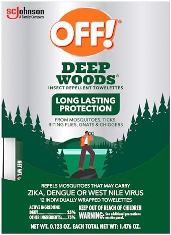 OFF! Deep Woods Sportsmen Towelettes are formulated with 25% DEET, and protect against ticks, biting flies, gnats, and chiggers, and mosquitoes that may carry the Zika, Dengue, or West Nile virus. Each box includes 12 individually wrapped Towelettes that are portable and easy to use. These mosquito wipes provides long-lasting protection for up to 8 hours, so that you can keep living life your way. Keep out of reach of children and pets. See the label for other precautions and usage directions.
