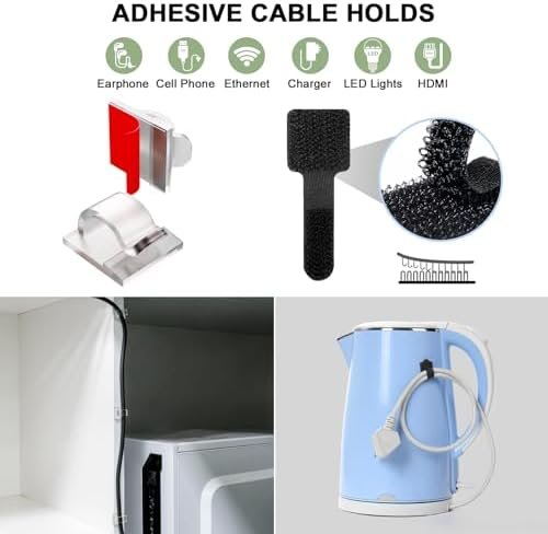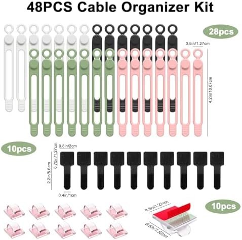 Value Pack: 28* silicone cable organizers with 4 colors, 10* cable clips, and 10* adhesive cable ties. Unlike other products, our cord management kit includes three different accessories: elastic silicone cable ties, adhesive cord clips, and adhesive cable ties, more choices for you.