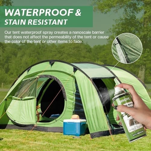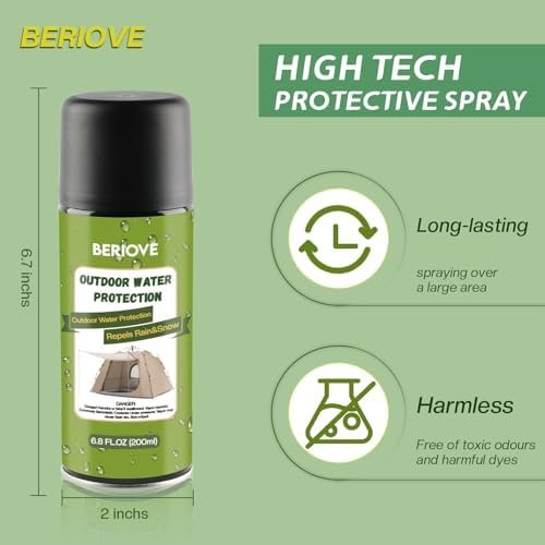 WATERPROOF & STAIN RESISTANT: BERIOVE Outdoor Water Shield Spray is waterproof and stain resistant, which greatly improves the life of your tents. Waterproofing spray for fabric outdoor does not change the look or feel of any fabric!