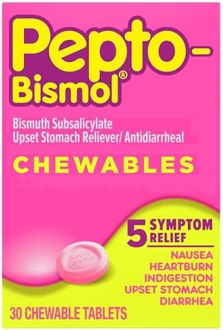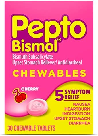 Pepto Bismol Cherry Chewable Tablets. When you have stomach troubles, Pepto’s coating action calms and soothes your stomach providing fast digestive relief from nausea, heartburn, indigestion, upset stomach, and diarrhea. When you have stomach troubles, Pepto’s coating action calms and soothes your stomach providing fast relief from nausea, heartburn, indigestion, upset stomach, and diarrhea. Here’s some 5 SYMPTOM DIGESTIVE RELIEF for you to chew on. Pepto Bismol Original Chewable Tablets are a portable and convenient way to treat symptoms.