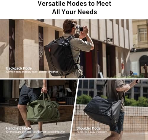Backpack mode: wide straps, waist strap, 35L main compartment, expandable front compartment.Shoulder mode: hidden straps, waist strap to shoulder strap conversion for cross-body use.Handheld mode: hidden handles in side zipper pockets.