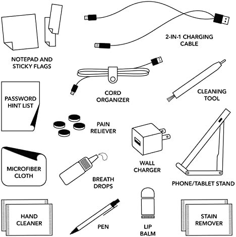 ALL-IN-ONE WORK ESSENTIALS – The hybrid kit comes with 18 tech, office and personal care items like – a notepad and sticky flags, pen, phone/tablet stand, cord organizer, 2-in-1 charging cable, and more – everything you need to get through the daily grind