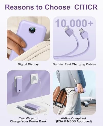 CITICR 12000mAh Portable Charger with AC Wall Plug and Built in Cables