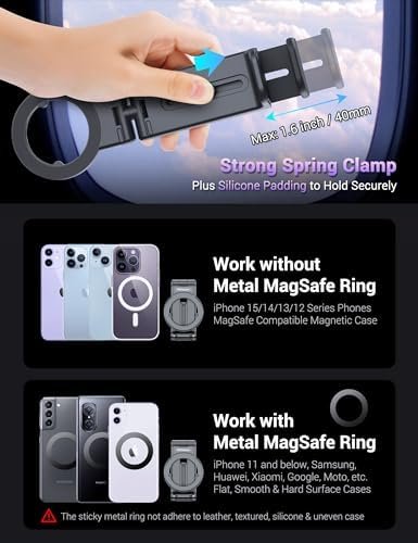 【The First MagSafe Plane Mount in the World & Works with All Phones】 It is specially designed for iPhone 15 / 14 / 13 / 12 series phones without case or with official MagSafe case or other third party MagSafe-compatible cases which have built-in magnets, no extra metal ring required. For iPhone 15 / 14 / 13 / 12 series phone with a regular Non-MagSafe compatible case and for other smartphones, you have to stick the 3M adhesive hollow metal ring included onto the back of your phone case.