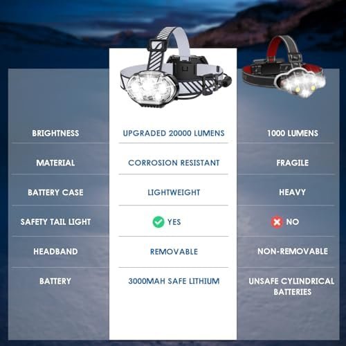 Illuminate Your World in All Directions: Designed in the USA, MIOISY head lamp features 5 powerful XPG and LED bulbs that provide up to 20000 lumens max, ensuring that you can see everything around you clearly.The hands free flashlights is perfect for exploring caves, night running, cycling, fishing, camping, construction work and other outdoor adventure activities. The red safety warning light switch is located on the back battery compartment to ensure all direction safety and emergency response