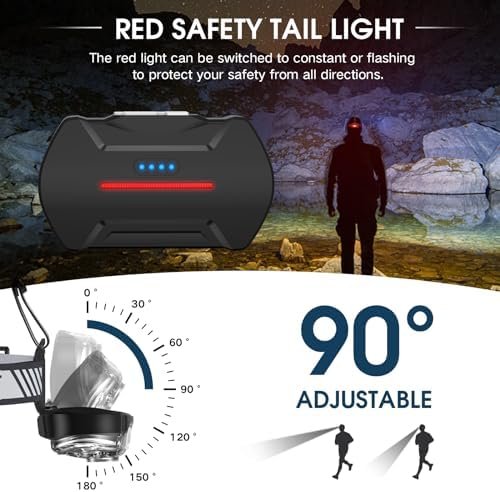 Adjustable Angle and Comfortable Headband: To ensure flexible lighting, our head lights for forehead can be adjusted 90°. And the hands-free headlamp provides bright and steady lighting while you work. The headlights for head use a soft and comfortable elastic headband that can be adjusted to fit different head size, perfect headlamps for adults and kids. Only weight 4.8 OZ, it’s comfortable to wear for long time, ensuring you can explore with ease.The band can be taken off to wash