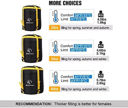 Temperature Range: 2lbs filling 80% cotton lined adult sleeping bag is comfort in 59°F/15°C and fits temperature range 50-77°F/10 – 25°C.3lbs filling sleeping bags is comfort in 50°F/10°C and fits temperature range 41-68°F/5-20 °C. 4lbs filling sleeping bags is comfort in 41°F/5°C, and fits temperature range in 32-59°F/0 – 15°C. Females are recommended to choose the thicker sleeping bags.