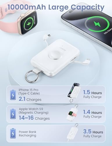 Meets all Your Charging Needs: RORRY portable charger with built in USB-C cable, iOS cable and magnetic wireless charger for iWatch , widely compatible with iPhone 15/14/13/12/11/XS/XR/SE Pro/Pro Max, Apple Watch Ultra 2/Ultra/9/8/7/6/SE/5/4/3/2, AirPods and more.