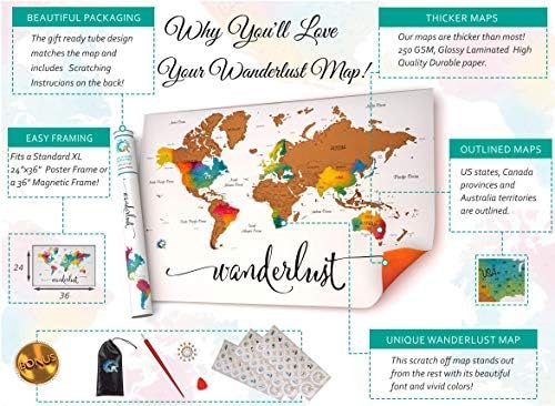 📐 PERFECT SIZE FOR FRAMING: This map is X-Large Standard Size- 24×36 inch, the largest scratch off map available on Amazon! It is twice the size of most scratch maps available. You will not be disappointed with the size of this map! Designed in the USA, this Wanderlust map fits a STANDARD size USA Extra Large 24×36 inch poster frame for easy framing! Or try framing this map with a 36″ magnetic frame, you’ll see this type of frame used in our video- it allows for easy future scratching!