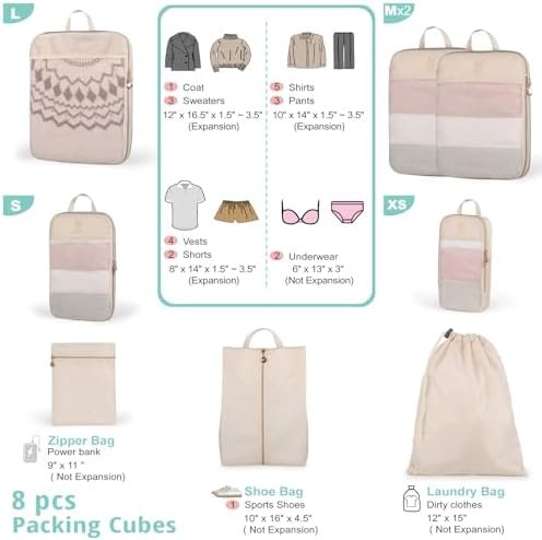 8 set What Will You Get: 1 large cube (12” x 16.5”x1.5-3.5”expansion), 2 medium cubes (10” x 14”x1.5-3.5”expansion), 1 small cubes (8” x 14”x1.5-3.5”expansion) , 1 Extra Small (6” x 13”x13” NOT expansion) shoe bag (10” x 16”x4.5”),Laundry Bag (12” x 15”),Accessories Bag (9”x 11”). Packing organizers of different sizes are used for different packing purposes. You can separate clothes (such as jackets, pants, t-shirts and socks) into different packing cubes for easy access.