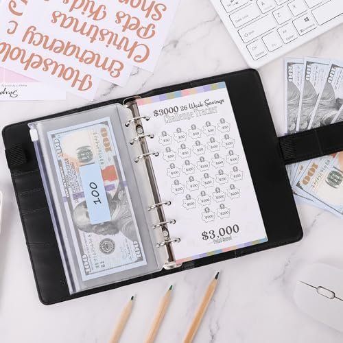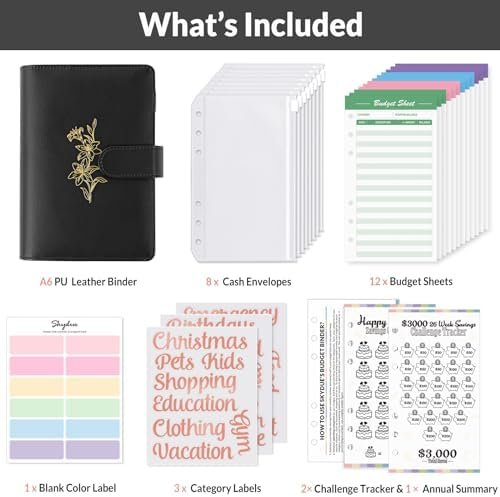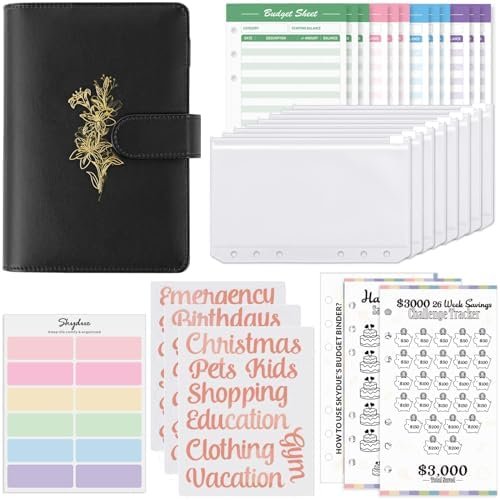 What You Get: A6 PU leather binder cover, 2pcs challenge trackers(26 Week/Birthday/Holiday Savings Challenge), 1 annual summary and usage introduction, 8pcs cash envelopes, 12pcs budget sheets, 3 sheets of category sticker labels, 12 blank color labels. SKYDUE’s upgraded envelope savings kit is perfect for all ages to manage their finances.