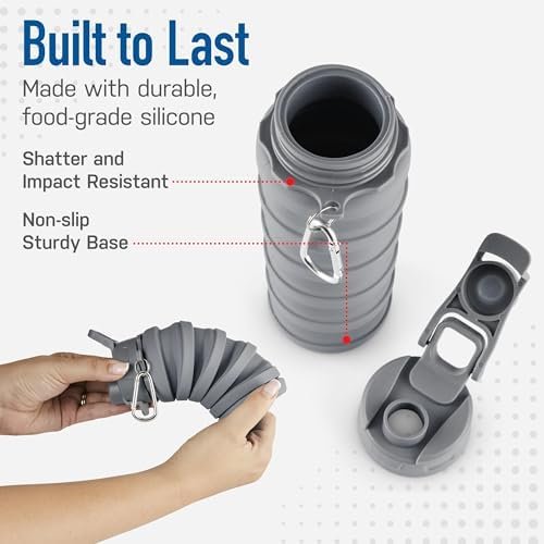 TOP FEATURES – Made with durable, food-grade silicone, this collapsible water bottle has a leak-proof design, a non-slip sturdy base, and is shatter and impact resistant. The perfect foldable water bottle for travel.
