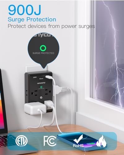 【900J Surge Protector Outlet】 USB wall outlet surge protector pass FCC, ETL Listed, ROHs certificate. Features 900 Joule surge protection rating to keep your electronics and mobile devices protected from voltage spikes. The light indicator remind you the surge protection is working.