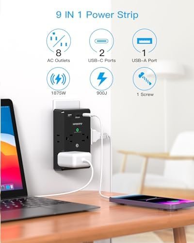 Surge Protector Outlet Extender with USB C Ports – 3 Sided Power Strip with 8 Ou…
