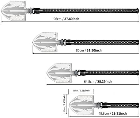 It includes Saw, dig, hook, shovel, wrench (4 different sizes). The shovel is made of Carbon stainless steel, which is strong and durable. These functions are achieved by changing the angle of the shovel and then tightening the nut.The handle is made of high-quality aviation aluminum alloy, which is thickened and durable but lightweight, the length of the handle can be changed from 19.2inch to 37.8inch according to your needs, which is very easy to assemble and use.