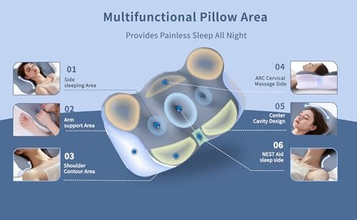 【Various Sleep Modes To Choose From —— Cervical Massage and Aid For Sleep 】The designer has created pillows with sleep patterns to choose from for two common situations, namely neck pain and insomnia:Sweet Moon pillow feature two sleep sides with different heights and hardness,three 3D support areas in the center suitable for side back stomach sleepers,and comfortable arm areas on both sides.By combining the slow rebound characteristics of selected memory cotton, Sweet Moon pillow can perfectly adapt to various situations and sleeping positions, allowing your body and mind to fully relax and recover during sleep.