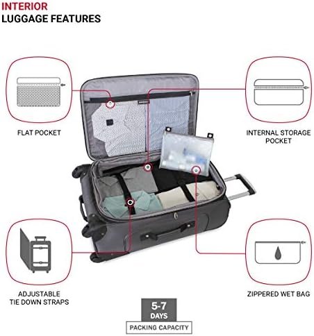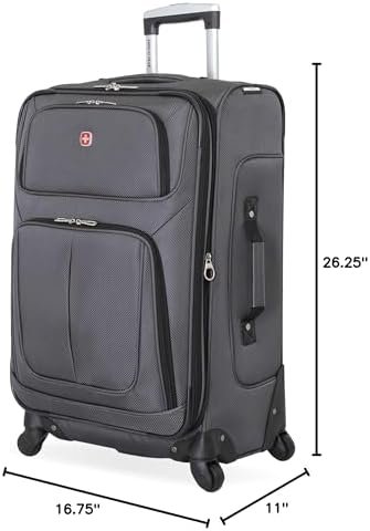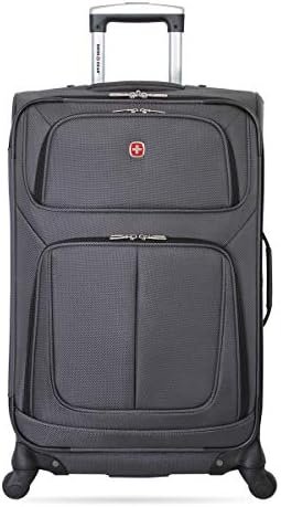 SwissGear Sion Softside Expandable Check-In Spinner Luggage gives you an ample amount of packing space when needed. This rolling suitcase features a locking push/pull handle system and four 360-degree multi-directional spinner wheels for convenient portability. It is made from a durable, scuff-resistant polyester fabric and its interior is fully lined. This check-in suitcase features adjustable luggage tie-down straps for securing garments in place, a removable zippered wet bag, a large mesh lid pocket, and a packing pocket for holding small items and accessories. It also includes two front panel pockets, a built-in ID tag, and padded top and side handles. At SwissGear, we continue to ensure whatever you need travels easily, safely, and stylishly with you. Great for a family trip or business travel.
