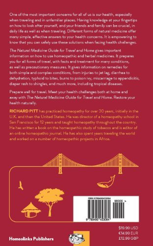 This book gives clear and important information on natural remedies for travel and in the home. It both prepares a person for all forms of travel and gives suggestions of natural remedies for both simple and complex conditions, from injuries to jet lag, diarrhea and much much more, including tropical diseases.It is unique in that it gives a comprehensive coverage of both regular travel issues as well as more exotic and tropical health challenges when traveling. It gives a detailed breakdown of the risks of different types of travel and the particular risks of certain conditions and it explores both conventional and alternative forms of prevention, looking at major travel vaccines used and their alternatives. It is also an excellent overall introduction to homeopathy and Natural Medicine in general, suitable for people who want to have one book that covers nearly all health contingencies in daily life. It both educates and informs on how any person can embrace the benefits of homeopathy and other Natural Medicines in a precise and accessible way. Being prepared for travel is always important and this book offers vital information on the challenges of travel and what can be done naturally to maintain and restore health.