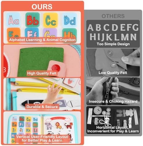 [8 in 1 ENDLESS FUN SENSORY BOARD] : Our montessori busy board toy offers 8 pages of fun with 21 toddler activities like life skills, 15 dress skills, 26 alphabets 10 numbers 12 colors 12 shapes 9 weathers 9 animals. Develop toddlers’ practical life skills, fine motor skills, logical thinking and hand-eye coordination, as well as develop the cognitive ability to recognize letters, numbers, shapes, colors, animals, clocks, and more. Each page of activities is fun and can keep children interested in them and learning as they play!