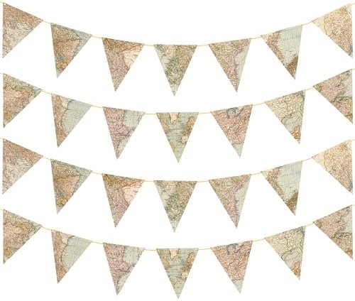 Are you ready for the travel around the world party?This travel themed party decoration includes 4pcs bon voyage map pennant banners, vintage travel elements will bring your party seems get into the around the world party. These vintage bon voyage map pennant banners can be applied for various happy moment, including travel theme birthday parties, around the world party, let the adventure begin party, adventure awaits party, bon voyage party, farewell retirement and more. Suitable size for indoor or outdoor parties.